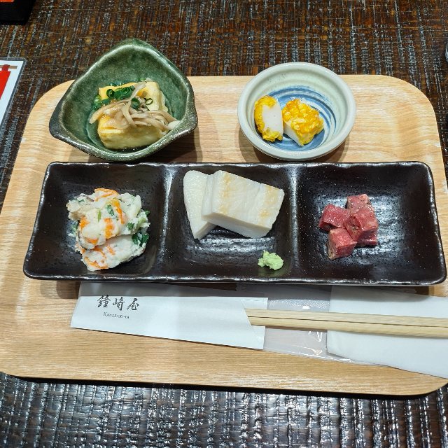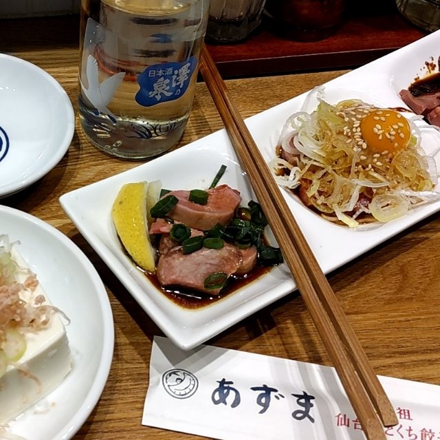 飲み比べ。おそらくオリジナル日本酒であろう鐘崎屋が一番好みでした。笹かまにめちゃくちゃ合う。おつまみセットは揚げ出し豆腐(左上)、コーンのかまぼこ(右上)、いぶりがっこのポテトサラダ(左下)、笹かま(真ん中)、牛タンの燻製(右下)。色々楽しめてお得。