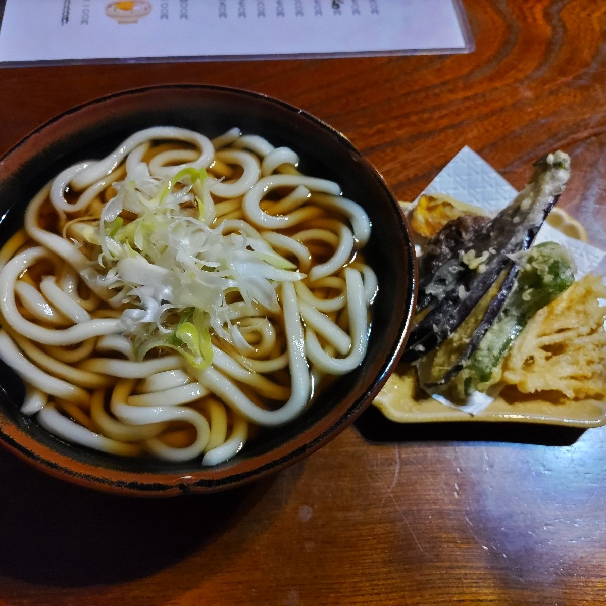 お昼の天ぷらうどん。お腹ひえひえだったので温かいうどん助かった。天ぷらさくさく。