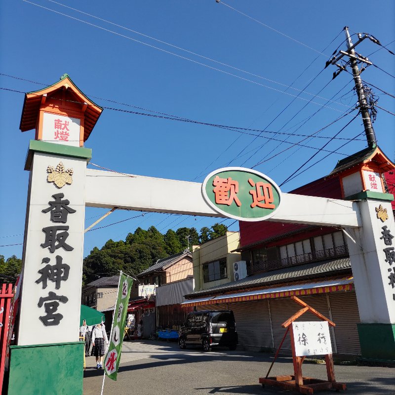 さて着きました香取神宮、いきなり校外学習の集団と行き合う。めっちゃ学生さんいた~。おかげでお土産屋さんも何個か開いていたので良かった。